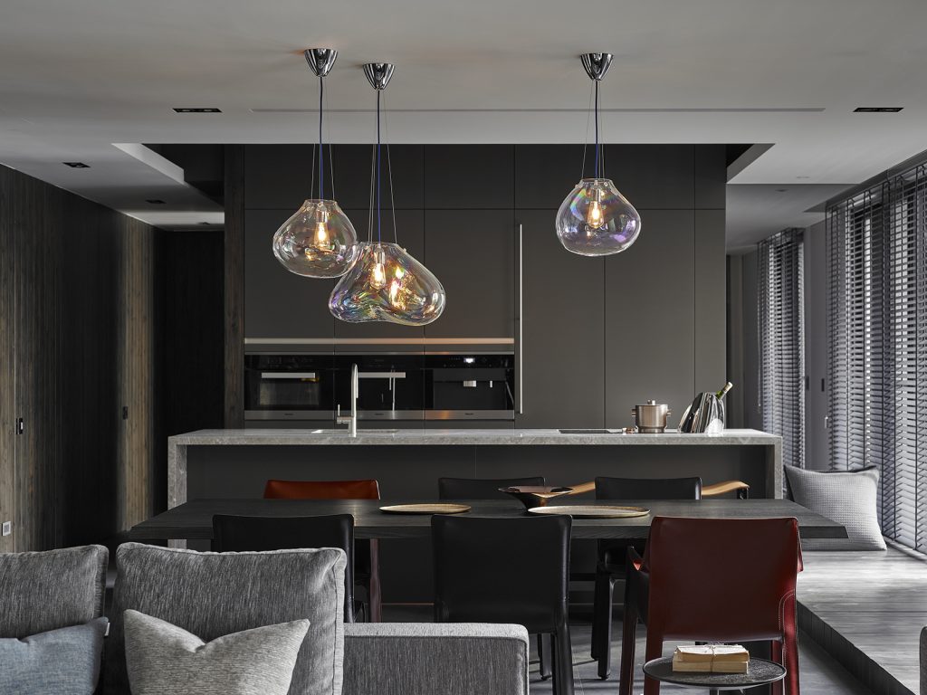 在餐廚空間安置中島吧檯,除了成為公領域動線的轉折點,站在中島的主人彷彿整個空間的中心,成為時尚又充滿生活感的現場。整面到頂的廚具立面,結合電器與收納櫃體,運用大理石材的潑墨紋理、鍍鈦金屬的光澤感、木紋線條等材質混搭,完美的尺度比例成為線條俐落、極簡切割的「美型收納」,營造出視覺焦點,讓人專注在場域線條的輪廓清爽、美麗優雅,化收納於無形,讓餐廚用具的海量收納圍塑出完整大器的空間,創造豐富的機能層次。