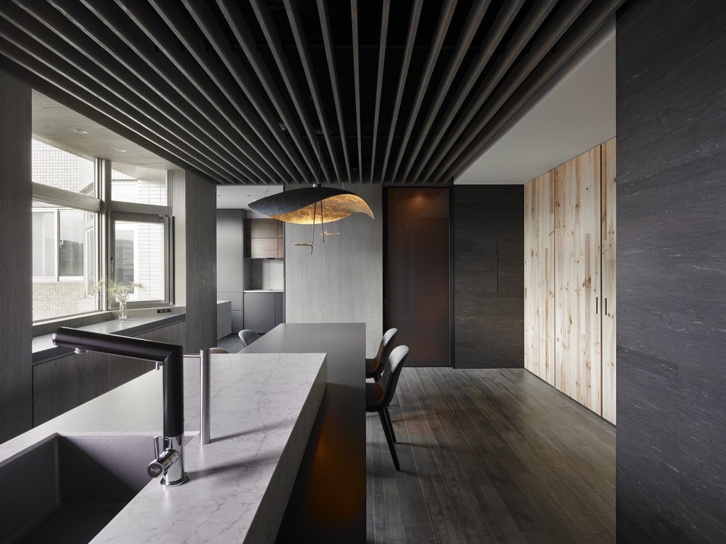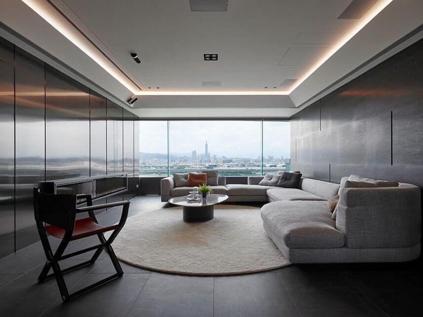 拆除原有牆面,封閉阻擋視線的不良採光,讓窗外景色延續拓印在前衛、科技感十足的金屬鍍鈦牆面上,猶如柔焦後山水潑墨般的視覺效果。