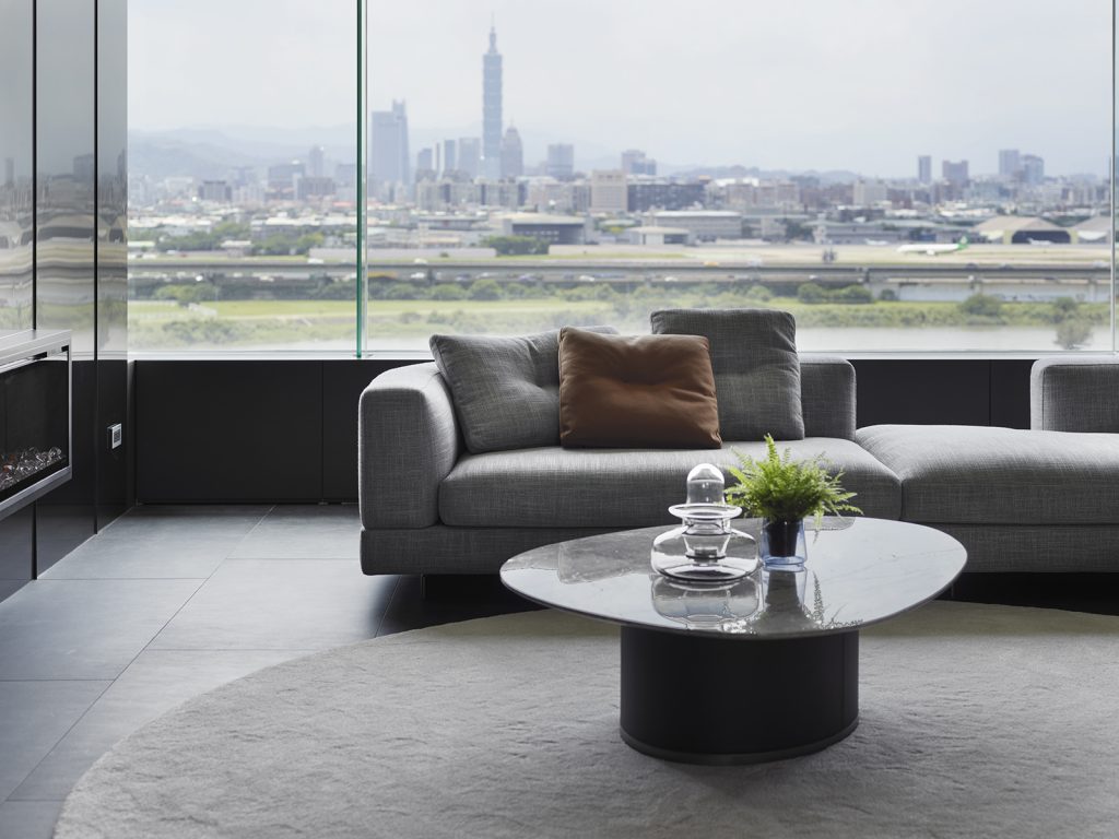 摒除沙發後方走道畸零空間,兩相平整拉齊,使客廳的格局方正俐落;背牆採用低調沉穩的消光霧面黑色大理石,嵌入斜邊創造層次感;空間裡刻意降低軟裝搭配、家具沙發,讓光與景在四季交織下舞動變幻。