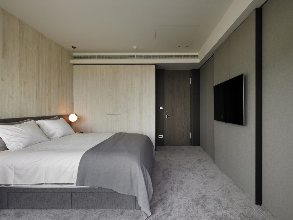 主臥室裡平整排佈的衣櫥櫃體取代舊有衣帽間的角落暗房;移動式衣櫥門片結合電視牆,隱藏線路更顯優雅;選用不經琢磨洗白木紋牆面,空氣中散發自然氣息。