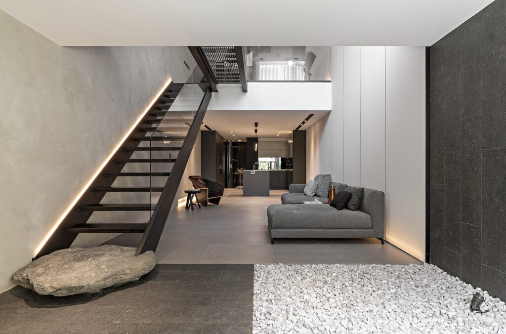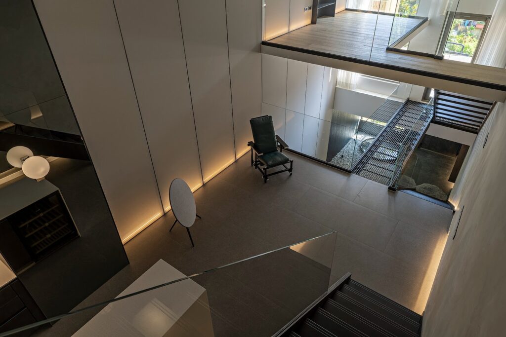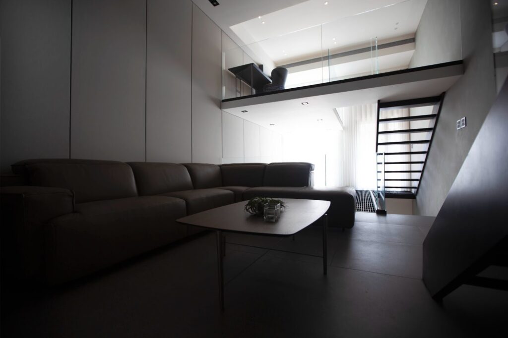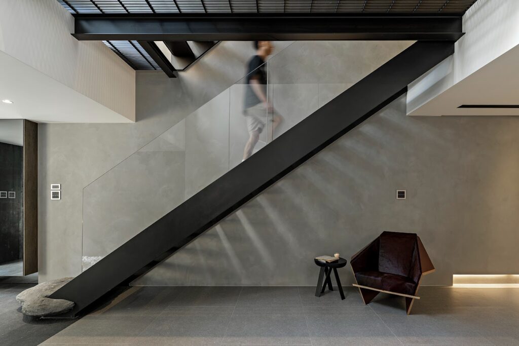 本案透過複層結構重新建立空間高度,將自然光自挑空區向下引入,改善原本陰暗的縱深問題。樓梯採用鐵件結構搭配石材踏板,在降低量體壓迫感的同時,維持動線清晰與行走穩定度。