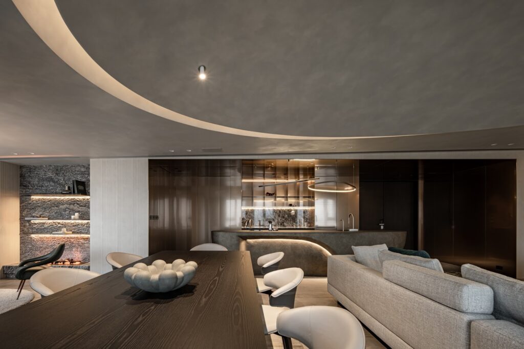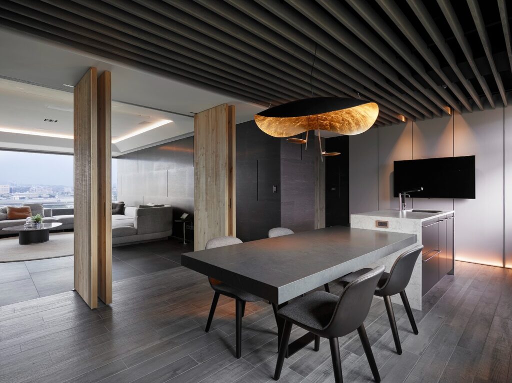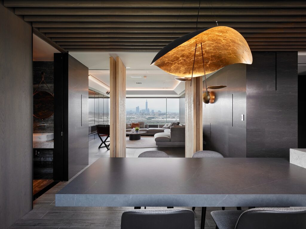 材質比例上,客廳背牆以霧面黑石為主,搭配金屬鍍鈦牆,整體控制在約 7:3 的冷暖配置。吸光材質負責穩定空間情緒,反射材質則負責引景與拉深視覺,避免空間過暗或過於刺激。
