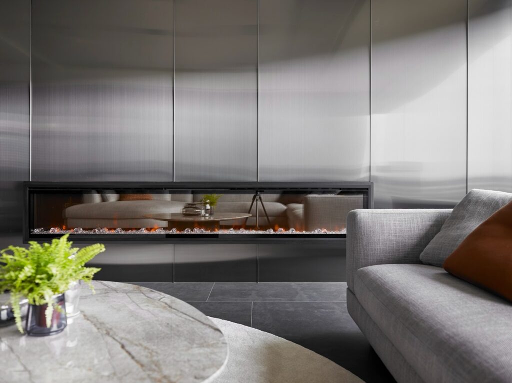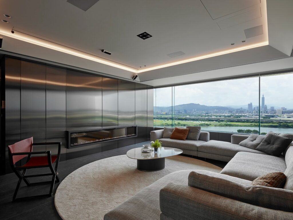 本案先實測窗外景觀的高度與主要視角,再於客廳主視線位置配置霧面鍍鈦牆,使窗外景色被引入室內,但不產生鏡面反射干擾。鍍鈦表面經霧化處理後,只保留輪廓與層次,形成柔焦般的遠景延伸感。