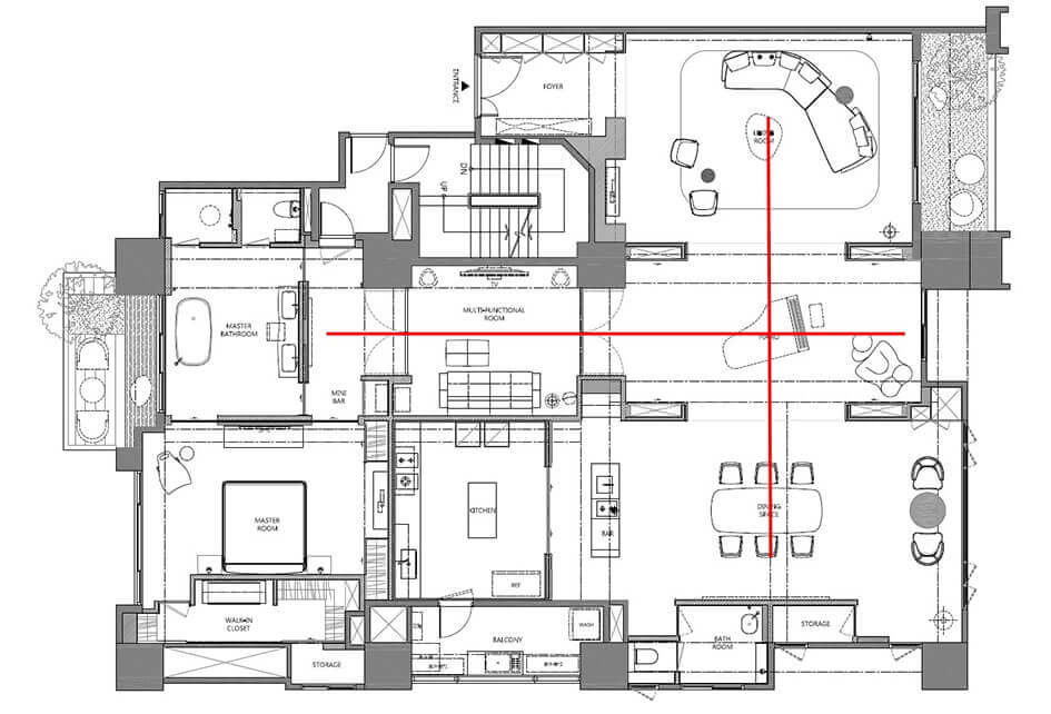 在敞闊寬大的百坪空間,只規劃了一間房間,其餘都以開放空間,將尺度推進到最大層次。空間結構採用了傳統古建築院落式的「一進、二進、三進」的意象,隱藏式拉門在必要時可拉上作為區隔。寬闊無盡的視線,讓人們在空間中產生一種既分離又穿透,彷彿在美術館或博物館遊賞的錯覺,而視線最終停留的位置,總在精心營造的藝術視覺主牆上。