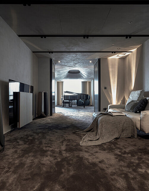 如廊道般的視聽室,從鋼琴到主臥之間,以穿堂方式設計,為屋主的各種使用情境,達到絕佳的彈性配置。當來訪賓客共享視聽設備,只需要將對主臥走道的門扇闔上即可劃分公私領域;當屋主希望從私領域這端享受視聽室,只需面向公領域的門關上。如果使用情境是讓如果希望以更靜謐的方式,全然專注地享受聲光音質,將兩側的門扇關上,就是完美的私人影音劇院。