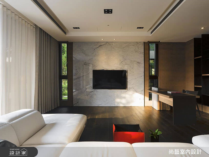 客廳,於天花加入適當線條打破拘泥,藉由格柵衍生向外延伸感,並於空間內加入大面積玻璃帷幕,使自然景觀綿延入室,且讓電視主牆成為唯一頂天立地的立面,體現不凡氣度;地板則選用淨透淺色大理石鋪陳,在木料、石材的搭配之中,塑造形同山林間的天寬地闊體驗;沿著階梯而上,則可見階差之間的巧妙鏤空設計,在串聯樓層之餘,也無礙窗景的四季更迭,將美好景致播映入室;餐廚區,以白淨大理石作基底,並選配內斂的廚具系統,展現自然寬闊的風格,並配置窗戶導入陽光,締造明亮美好的餐廚情境;起居室,選用較為安靜的配色、材質,彰顯極致的靜謐,同時給予淺色大理石建材,營造山川流水的原始風情,鋪敘精彩的空間風情!